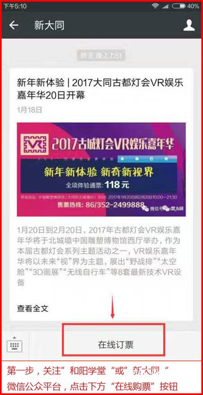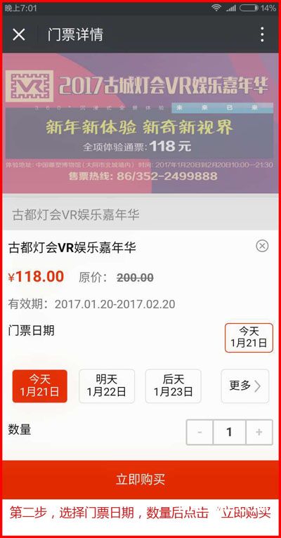 為了有更好的活動(dòng)體驗(yàn),節(jié)省游客的排隊(duì)買(mǎi)票時(shí)間,古都燈火VR嘉年華特別在“大同市和陽(yáng)學(xué)堂”和“新大同”微信平臺(tái)同時(shí)開(kāi)設(shè)了網(wǎng)絡(luò)售票通道,無(wú)需排隊(duì)無(wú)需等待,關(guān)注“大同市和陽(yáng)學(xué)堂”或“新大同”(微信號(hào):sxdt_net)微信公眾平臺(tái),在線購(gòu)票后可以持電子門(mén)票掃碼直接入場(chǎng)。