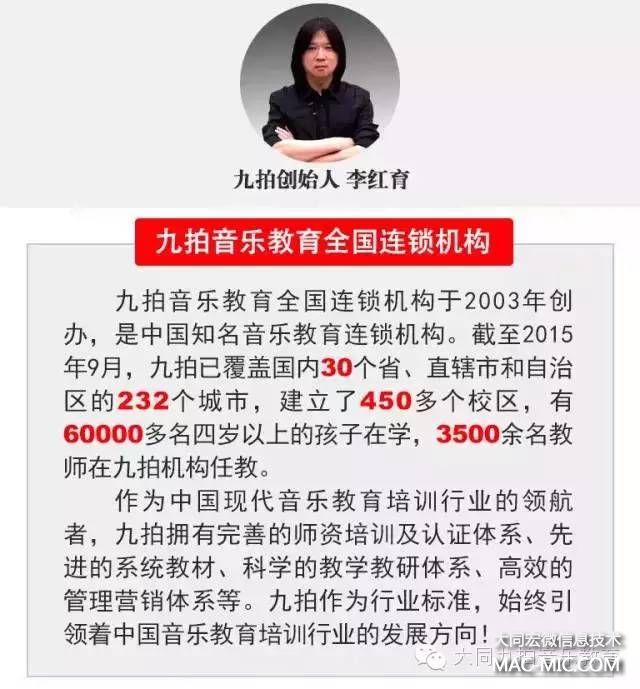 九拍教育科技集團(tuán)由李紅育老師于2003年創(chuàng)建,2015年九拍音樂(lè)教育全國(guó)連鎖強(qiáng)勢(shì)進(jìn)駐大同,總部設(shè)立在天津市南開(kāi)學(xué)府創(chuàng)新園區(qū)。2006年,注冊(cè)成立了天津市九拍文化藝術(shù)發(fā)展有限公司,主要業(yè)務(wù)為音樂(lè)教育培訓(xùn)、樂(lè)器產(chǎn)品銷售及文化交流活動(dòng)。