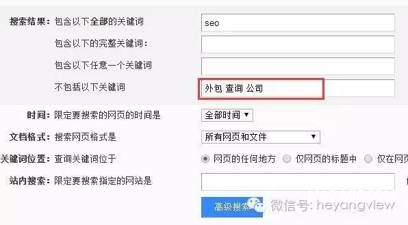 我們可以利用高級搜索工具對搜索結果頁面進行篩選,比如我們查詢“seo”關鍵詞,但是我們不想看出現seo外包,seo公司,seo查詢這一類的網站的,此時我們就可以在,限制關鍵詞中添加“外包 查詢 公司”即可;