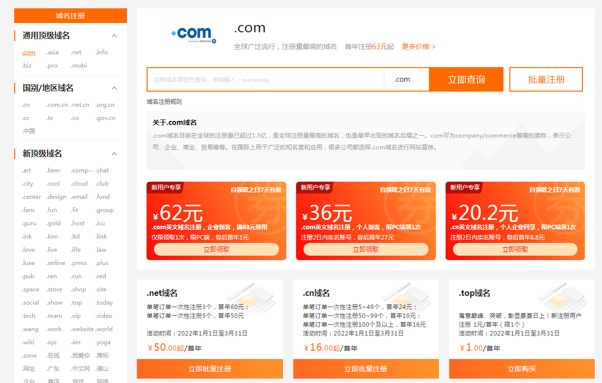 域名(需每年續(xù)費(fèi))  國(guó)內(nèi)域名注冊(cè)商一共也沒(méi)多少家,全國(guó)比較知名的就阿里云(以前的萬(wàn)網(wǎng))、新網(wǎng)這些的,其他小的注冊(cè)商幾乎都是這些大公司的代理,域名注冊(cè)費(fèi)用每年都在變,但是基本上價(jià)格浮動(dòng)不是很大。