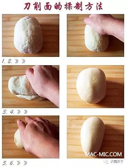 刀削面對和面的技術要求較嚴,水、面的比例,要求準確,一般是一斤面三兩水,打成面穗,再揉成面團,然后用濕布蒙住,餳半小時后再揉,直到揉勻、揉軟、揉光。如果揉面功夫不到,削時容易粘刀、斷條。