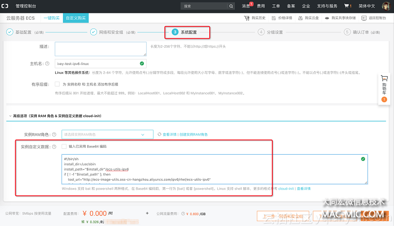為了便于測試建議勾選 分配公網(wǎng) IP 地址,此公網(wǎng) IP 地址為 IPv4。根據(jù)頁面提示,在公測期間需要為實例配置 cloud-init 腳本即 實例自定義數(shù)據(jù)(暫時需要手工配置,未來系統(tǒng)會自動處理),如下圖所示: