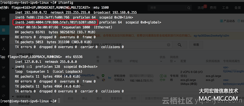 您可以通過 IPv4 公網(wǎng) IP 登錄到機器上,ifconfig 查看 IPv6 地址,如下圖所示: