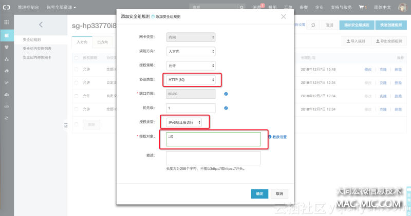 如果您的本機網(wǎng)絡(luò)支持 IPv6,可以為該實例 開通 IPv6 網(wǎng)關(guān)公網(wǎng)帶寬,然后直接在本地瀏覽器里輸入 http://[your_ipv6_address] 即可訪問, 需要注意在該實例的安全組里配置 IPv6 入方向 80 端口。如下圖所示: