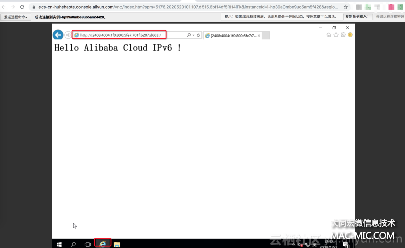 筆者由于本地網(wǎng)絡(luò)不支持 IPv6,因此又用上述步驟購買了另一臺 Windows 實例(配置好 IPv6),然后通過 VNC(控制臺遠程連接)連接該實例,然后通過瀏覽器訪問上述第 7 步部署的 Web 服務(wù),如下圖所示: