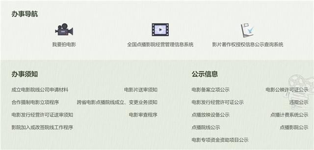 在國(guó)家電影局官網(wǎng)上,可以看到一些辦事導(dǎo)航,比如我要拍電影、全國(guó)點(diǎn)播影院經(jīng)營(yíng)管理信息系統(tǒng)、影片著作權(quán)授權(quán)信息公示查詢(xún)系統(tǒng)等。
